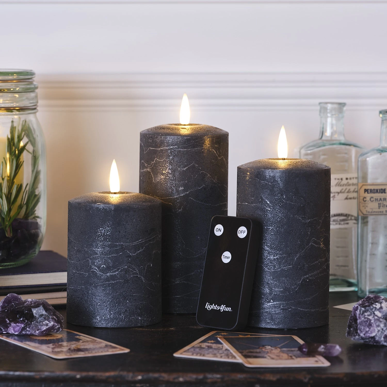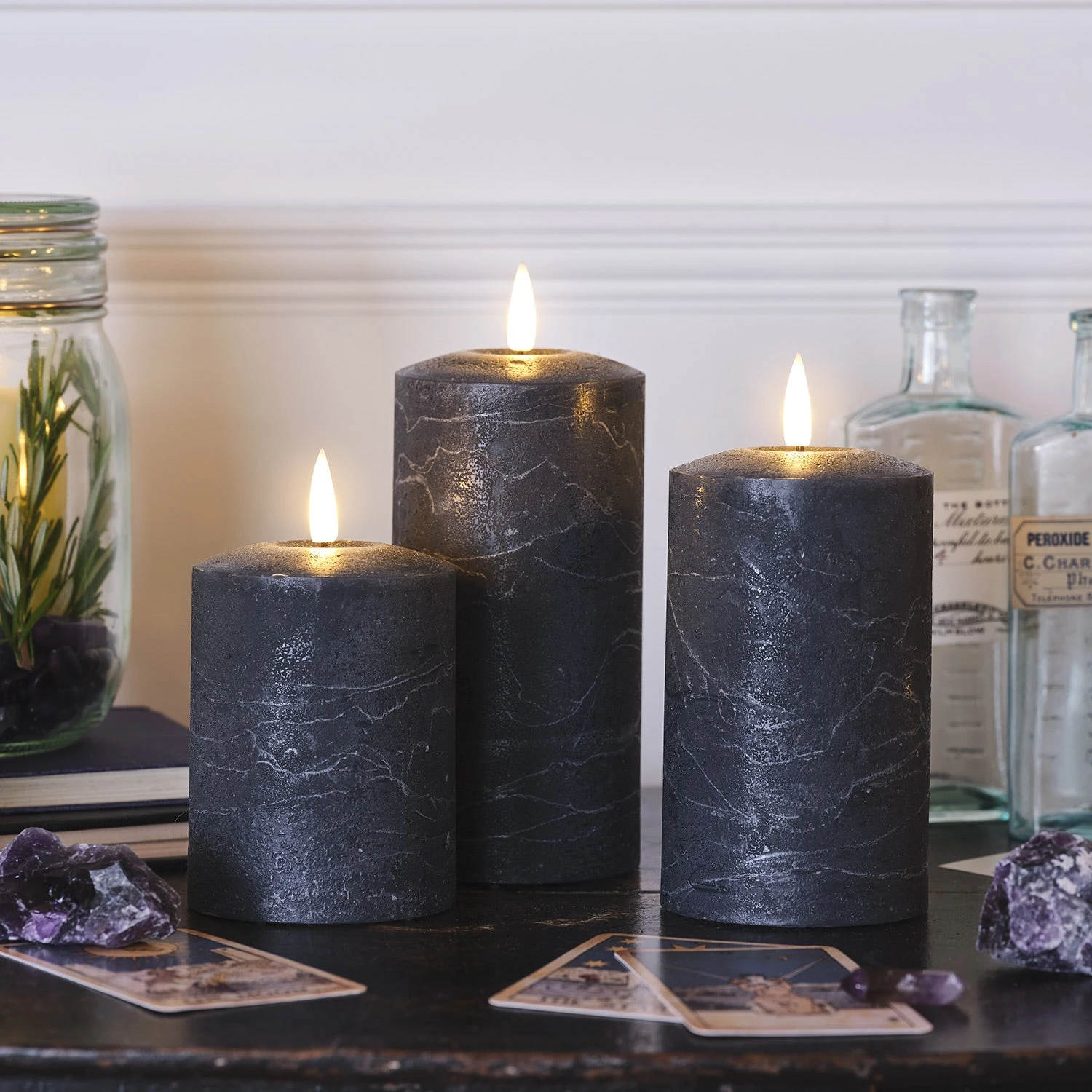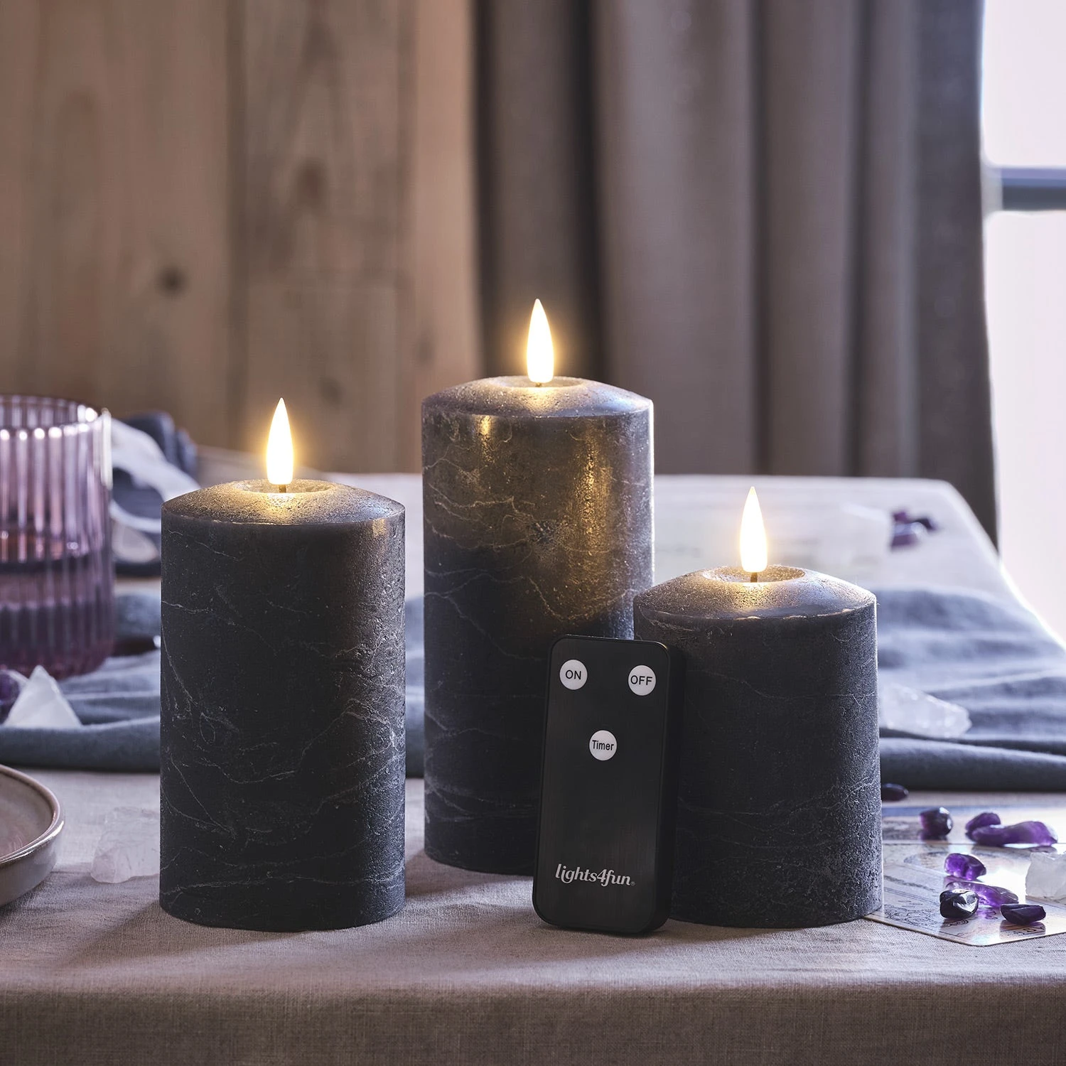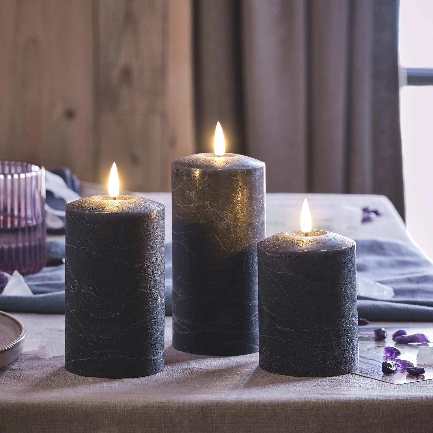 Stylisez votre décoration d’intérieur d’une touche moderne avec ces bougies piliers TruGlow®. Avec leur finition gris foncé marbré, elles sont incontournables ! || Combinant de la vraie cire coulée à la main à une technologie innovante, ce trio de bougies donne l’impression d’avoir été tout juste allumé et ressemble à s’y méprendre à de vraies bougies. Déclinées en trois tailles différentes de 10, 12,5 et 15 cm, les bougies requièrent 2 piles AA chacune pour être allumées. Utilisez la minuterie de 6 h pour profiter d’une lueur douce à la maison, sans lever le petit doigt.