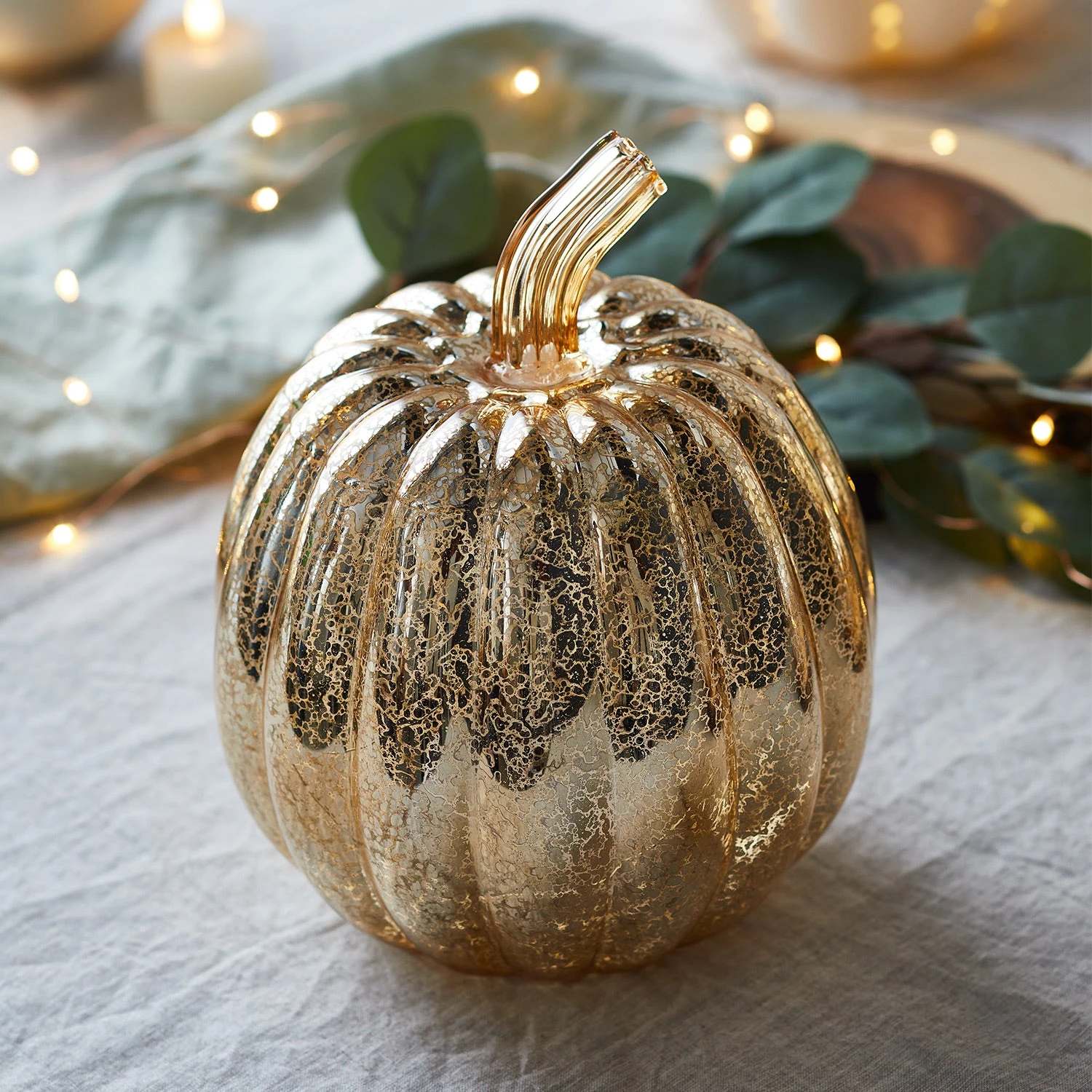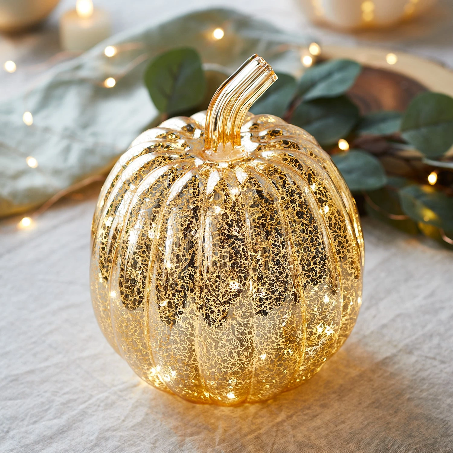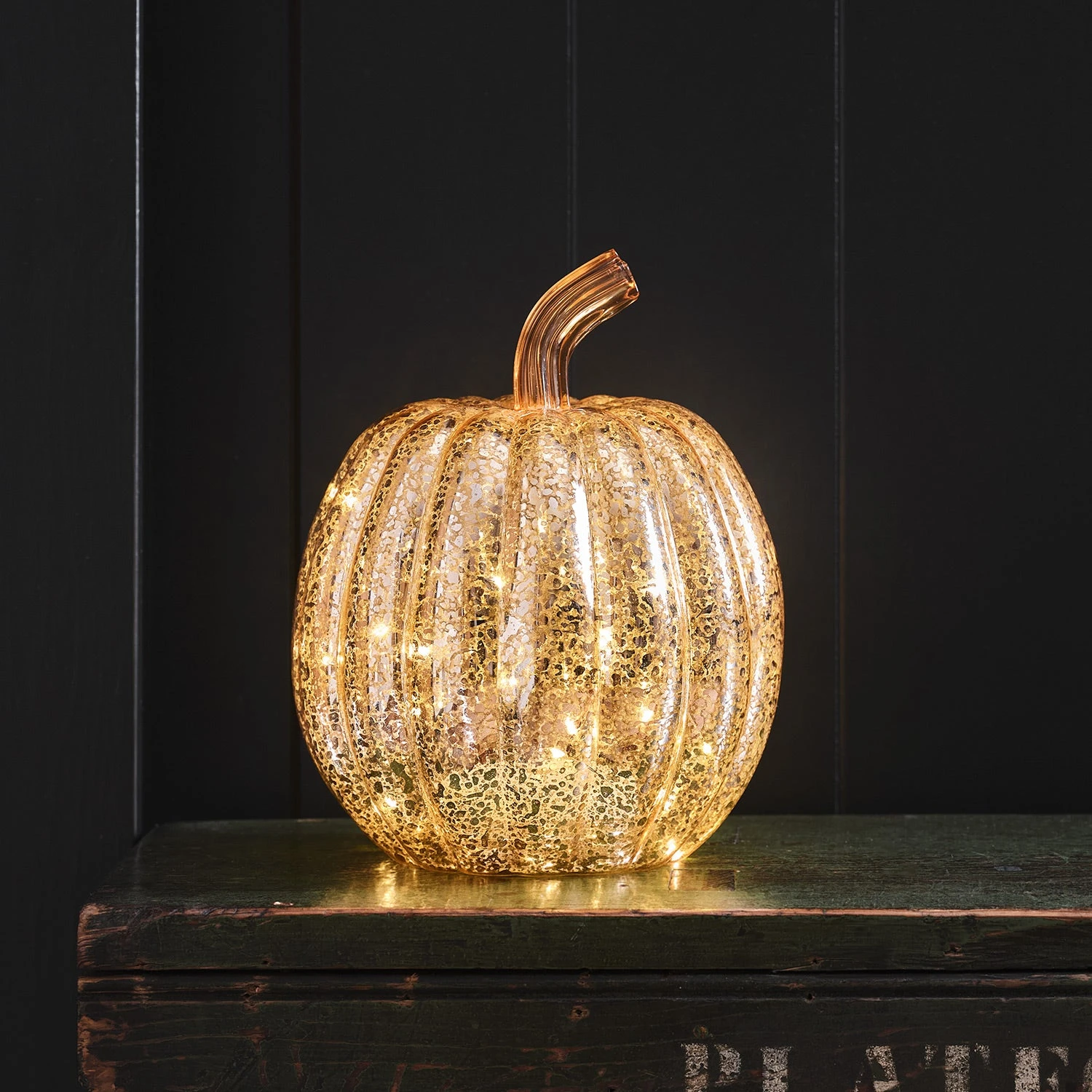 Avec sa finition dorée vieillie, notre citrouille lumineuse en verre sera la pièce maîtresse de votre déco de table ! || Qu’elle soit allumée ou non, elle sera du plus bel effet. La lumière des 15 LED qu’elle abrite se reflétera joliment sur ses parois, diffusant une lueur chaleureuse le soir venu. Insérez tout simplement 3 piles AA dans la base de la citrouille et choisissez la fonction minuterie 6h pour un allumage automatique soir après soir.