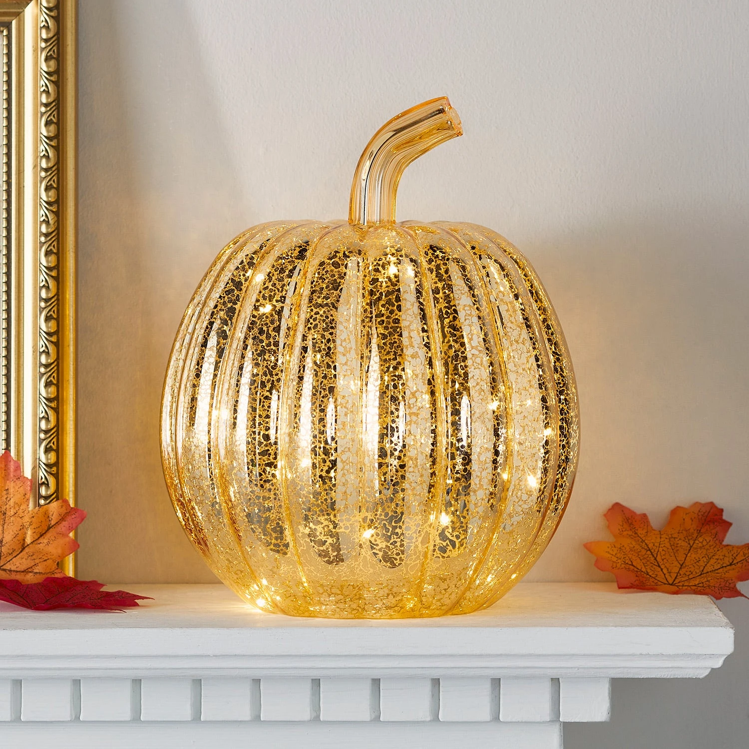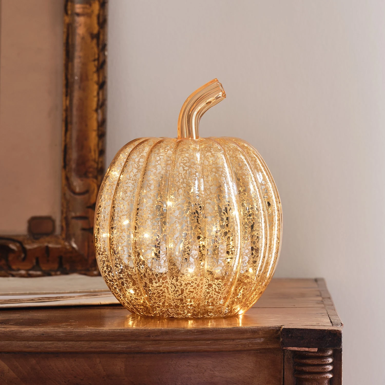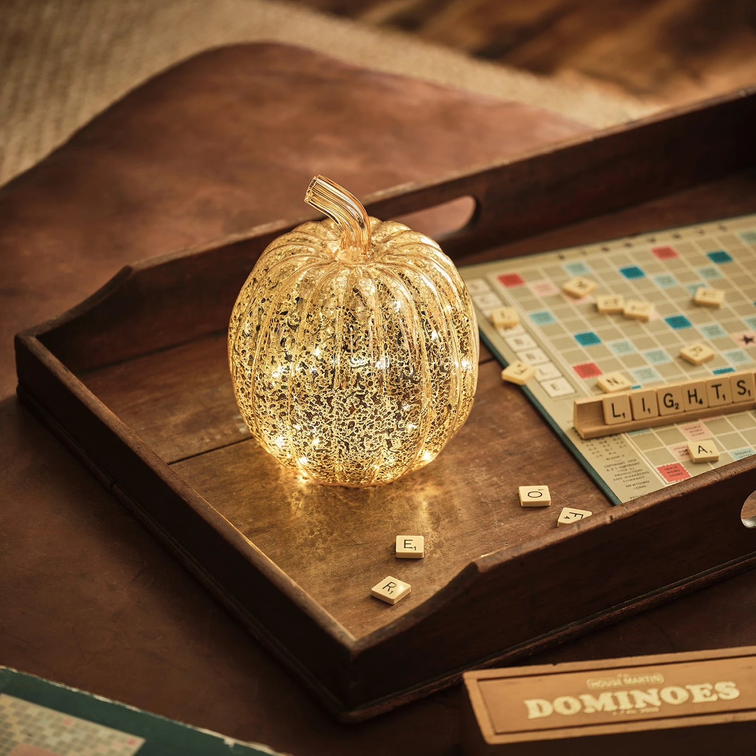 Avec sa finition dorée vieillie, notre citrouille lumineuse en verre sera la pièce maîtresse de votre déco de table ! || Qu’elle soit allumée ou non, elle sera du plus bel effet. La lumière des 15 LED qu’elle abrite se reflétera joliment sur ses parois, diffusant une lueur chaleureuse le soir venu. Insérez tout simplement 3 piles AA dans la base de la citrouille et choisissez la fonction minuterie 6h pour un allumage automatique soir après soir.